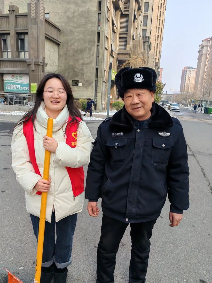 食工S23谢新妮2月7日在山东省潍坊市金鼎华府小区参加洁美家园扫雪行动