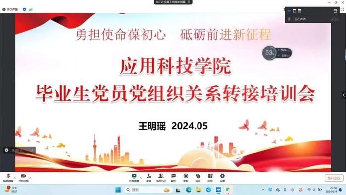 6月4日,学院辅导员王明瑶通过线上会议的方式为毕业生党员进行了党组织关系转接培训,她详细的介绍了党组织关系转接相关工作流程及注意事项,详细解答了大家的疑惑,为确保毕业生党员能够及时进行党组织关系转接打下了坚实基础。
