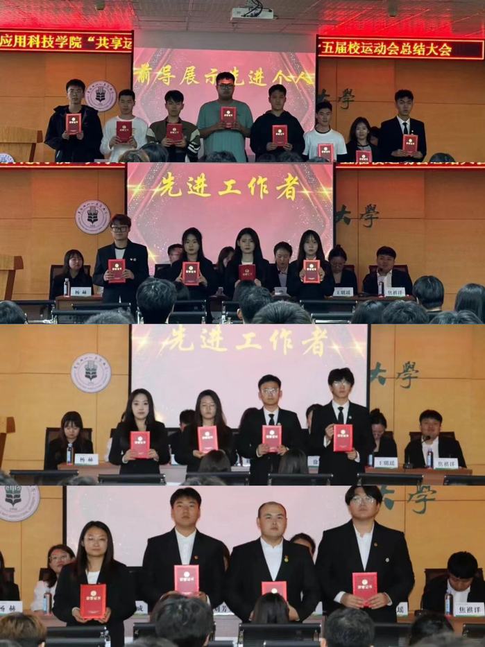 会上,首先由焦祺洋老师宣读学院团委对运动会先进个人和先进集体的表彰决定。随后,与会领导和老师为优秀运动员、突出贡献运动员、表演赛先进个人、前导队展示先进个人、勇夺桂冠先进个人、先进班集体、先进工作者等43名个人和4个优秀集体颁发奖状。