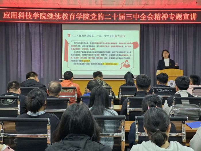 为深入学习贯彻党的二十届三中全会精神,增强学院教职工、宣讲小分队成员学习宣传贯彻全会精神的思想自觉和行动自觉,10月9日,学院召开党的二十届三中全会精神宣讲会,公司党委书记、校宣讲团成员姜玉美作宣讲报告,学院全体教职工及宣讲小分队成员参会。