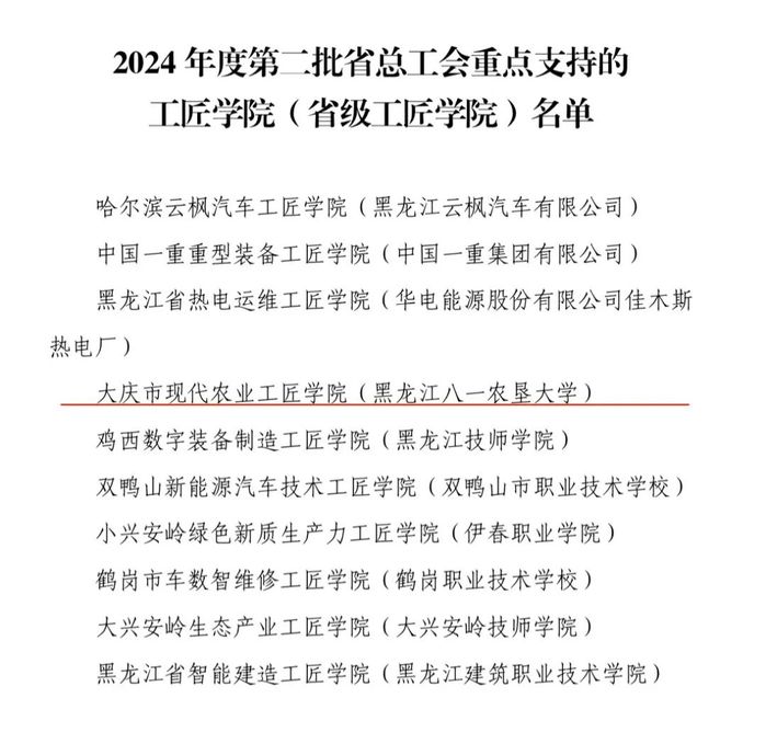 近日,黑龙江省总工会发布《关于做好2024年度全国总工会重点支持的工匠学院数智化建设有关工作的通知》,公布2024年度第二批省总工会重点支持的工匠学院(省级工匠学院)名单,公司大庆市现代农业工匠公司成功入选。