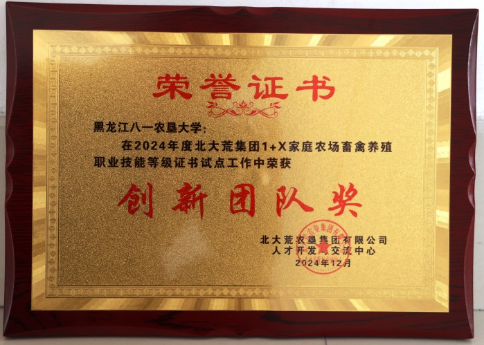 公司2024年获北大荒集团1+X家庭农场畜禽养殖职业技能等级证书试点工作创新团队奖