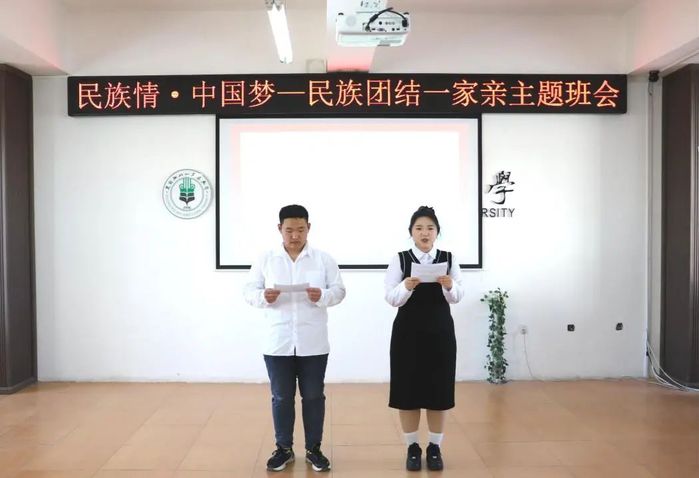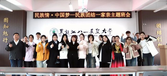 活动现场精彩纷呈,第一篇章“舞动华夏,共筑团结”中,努尔比耶·艾海提同学以热情奔放的新疆舞蹈《欢乐的跳吧》惊艳开场,点燃现场热情,展现民族团结力量;第二篇章“诵读经典,礼赞盛世”里,王浩安与姜佳琪同学诗歌朗诵《同心共筑华夏梦》,铿锵之声诉说对祖国热爱与祝福,激发爱国情怀与民族自豪感;第三篇章“民族风情,共话传承”环节,吴娇与任文蕊同学化身文化使者,分享彝族火把节与傣族风土人情,展现民族文化丰富多彩;第四篇章“北大荒精神,薪火相传”中,辅导员杨赫带来《丰碑下的麦穗:王震将军与八一农大的世纪传承》讲座,讲述王震将军事迹,让同学们体会北大荒精神的时代价值;第五篇章“班歌合唱,凝聚力量”时,全体员工齐声合唱班歌《微微》,用歌声传递团结希望,许下为实现中国梦不懈奋斗的庄严承诺。