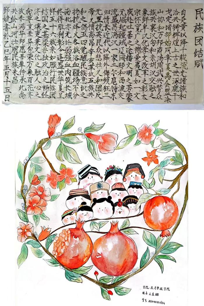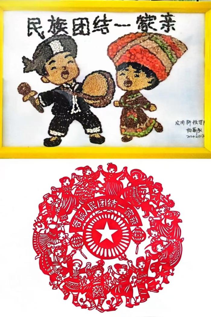 活动自启动以来,同学们围绕“民族团结”“文化共融”等主题,展开丰富创作。书法作品中,行云流水的毛笔字,将民族团结的美好愿景凝于笔端;绘画作品中,鲜活的人物呈现各民族交往交流交融的美好图景;剪纸、手工艺品等作品更是别具匠心,通过巧妙的设计与精湛的工艺,将各民族特色文化符号融入其中,诉说着“中华民族一家亲”的温暖故事。