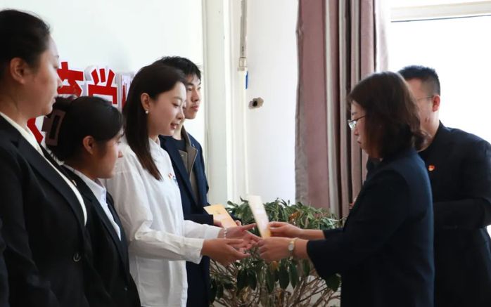 “我志愿加入中国共产党……”在党旗见证下,各党支部书记为毕业生党员佩戴党徽,党委副书记刘芳芳带领党员重温入党誓词。铿锵誓言回响会场,传递着对党忠诚的坚定信念,更凝聚起薪火相传、接续奋斗的磅礴力量。