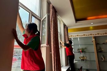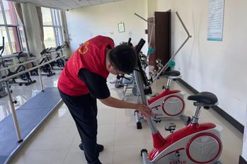 活动当天,在福利院工作人员的专业引导下,实践团成员迅速分为两组,精准对接餐饮部与社工部的服务需求,有序开启卫生清理志愿服务。他们手持清洁工具,仔细打扫储物柜上的积尘,反复擦拭走廊过道与栏杆的每一处角落,认真清洁娱乐器械与健身器材,耐心洗刷玻璃上的污渍。红色志愿马甲在阳光下格外醒目,汗水浸湿衣衫却挡不住真诚的笑容,志愿者们忙碌的身影,交织成福利院中最动人的风景线。