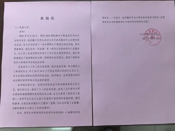 近日,学院机制G25(2)班任星宇、张济麟两位同学拾金不昧的事迹,在校内外引起了各方媒体的广泛关注与师生群众的热烈反响。9月30日,两位同学在大庆市政务服务中心办理身份证的过程中,于大厅二楼楼梯口捡到一条金项链后,两位同学未作迟疑,第一时间共同决定将物品送至一楼服务总台,并积极配合工作人员完成失物登记工作。他们的善举不仅体现了个人品德的高尚,更展现了新时代青年对社会责任的自觉担当。“我们当时就想,失主一定非常着急,要尽快物归原主。”任星宇同学朴实的话语中透露出真诚的善意。