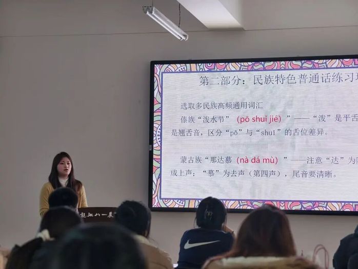 本次培训立足前期反馈,升级“考点精研+场景化实训”教学模式,重点突破朗读短文、命题说话等普测难点模块。培训结合真题案例,拆解了语调起伏、停连重音等核心技巧,将精选的易错音节、多音多义字汇编成专项训练手册。通过分组诵读、一对一纠错等互动形式,同学们在高强度实战中有效校准了表达偏差。课堂上,同学们踊跃参与角色扮演、即兴表达等练习,主动交流备考困惑,在思维碰撞与互助学习中夯实语言基础,学习热情持续升温。