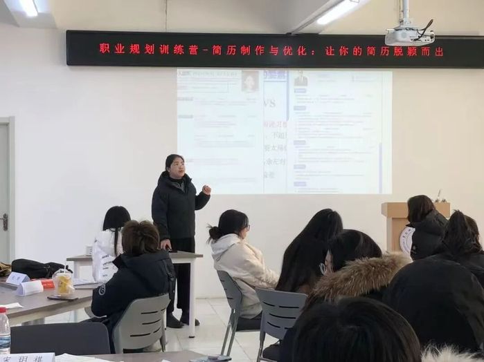 在职业技能提升环节,学院特邀学校就业处王东老师讲授《简历制作与优化》课程。王老师通过真实招聘案例解析与现场简历诊断,系统传授了简历撰写的核心逻辑与实用技巧。课程重点讲解了如何精准匹配岗位、运用关键词优化提升筛选通过率,以及通过排版优化、动词前置等方式打造简洁有力的简历版面。