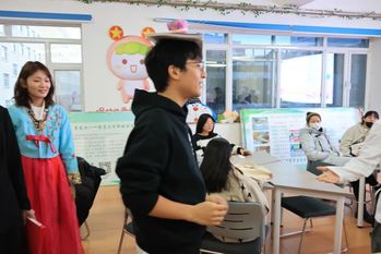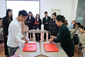科普环节结束后,活动负责人介绍了游戏规则。三十名同学分成六支队伍,开启了一场充满挑战与趣味的竞赛。汉族传统游戏投壶展现“礼”与“射”的韵味,朝鲜族顶碗竞走考验专注与平衡,蒙古族抓子游戏锻炼手眼协调能力,民族趣味答题则检验大家的文化知识储备。活动现场气氛热烈,辅导员潘妍也积极参与其中,不仅在赛后为获奖同学颁发奖品,还加入蒙古族抓子游戏,与同学们一起掷骰子、抛引子、接抓骰子,亲身体验传统游戏的乐趣,将现场氛围推向高潮。