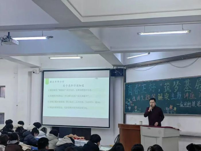 讲座围绕选调生政策、基层就业路径与成长经验展开。杨琪首先系统解读了学院推荐选调生的具体办法,从政策背景、报名条件、选拔流程、培养机制等方面进行了详细介绍,帮助同学们全面了解基层就业的政策支持与发展前景。