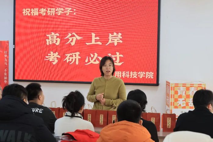 党委副书记刘芳芳与全体辅导员老师来到现场,将精心准备的考研助力礼包一一送到员工手中。