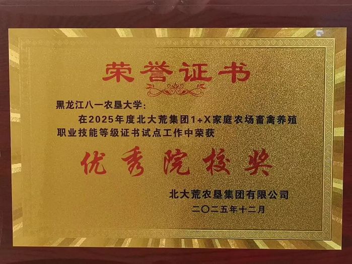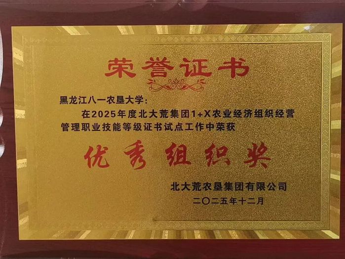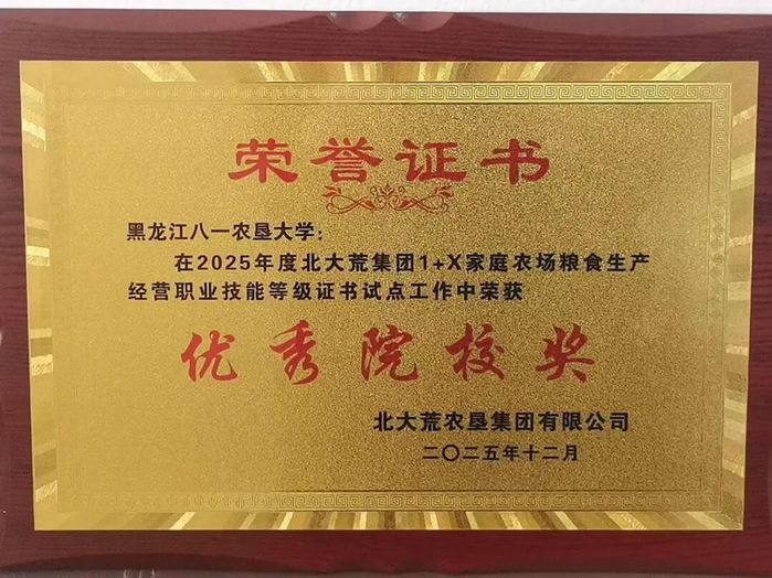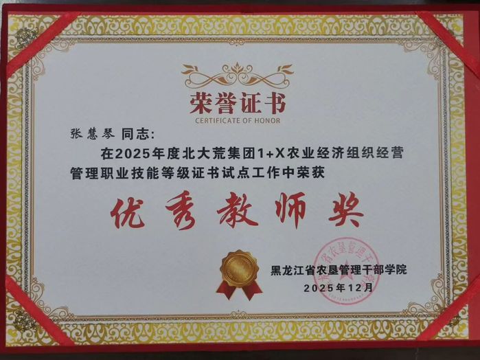 近日,学校在2025年度北大荒集团“1+X”职业技能等级证书试点工作总结表彰中,荣获“优秀院校奖”和“优秀组织奖”。经济管理学院张慧琴老师和信息与电气工程学院齐邦建老师荣获“优秀教师奖”。